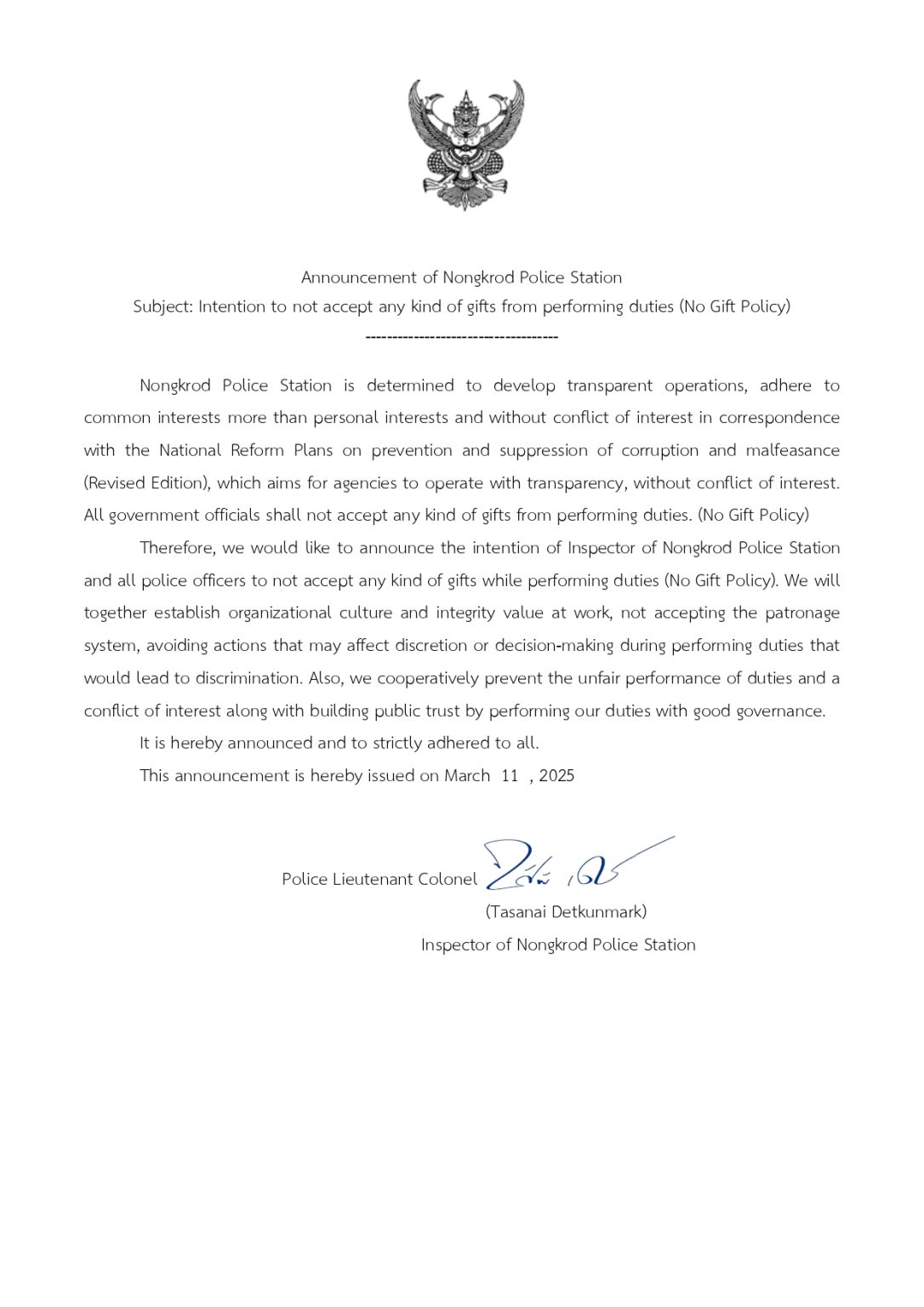 สภ.หนองกรดเรียน ผู้บังคับบัญชาวันที่ ๑๗ ต.ค.๖๘ เวลา ๐๙.๔๕ น.พ.ต.ท.ทัศนัย เดชคุณมาก สว.สภ.หนองกรด พร้