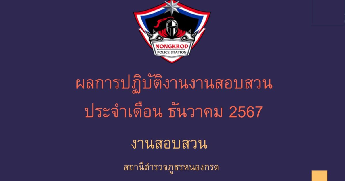 ผลการปฏิบัติงานงานสอบสวน ประจำเดือน ธันวาคม 2567 31 ธันวาคม 2024 โดย admin / ข่าวประชาสัมพันธ์,ผลการปฏิบัติงานในสถานีตำรวจ 5 สายงาน,งานสอบสวน,ข่าวประชาสัมพันธ์,ผลการปฏิบัติงานในสถานีตำรวจ 5 สายงาน ดาวน์โหลดไฟล์ PDF ผลการปฏิบัติงาน เดือน ธ.ค.67 ดาวน์โหลดไฟล์ WORD ผลการปฏิบัติงาน เดือน ธ.ค.67