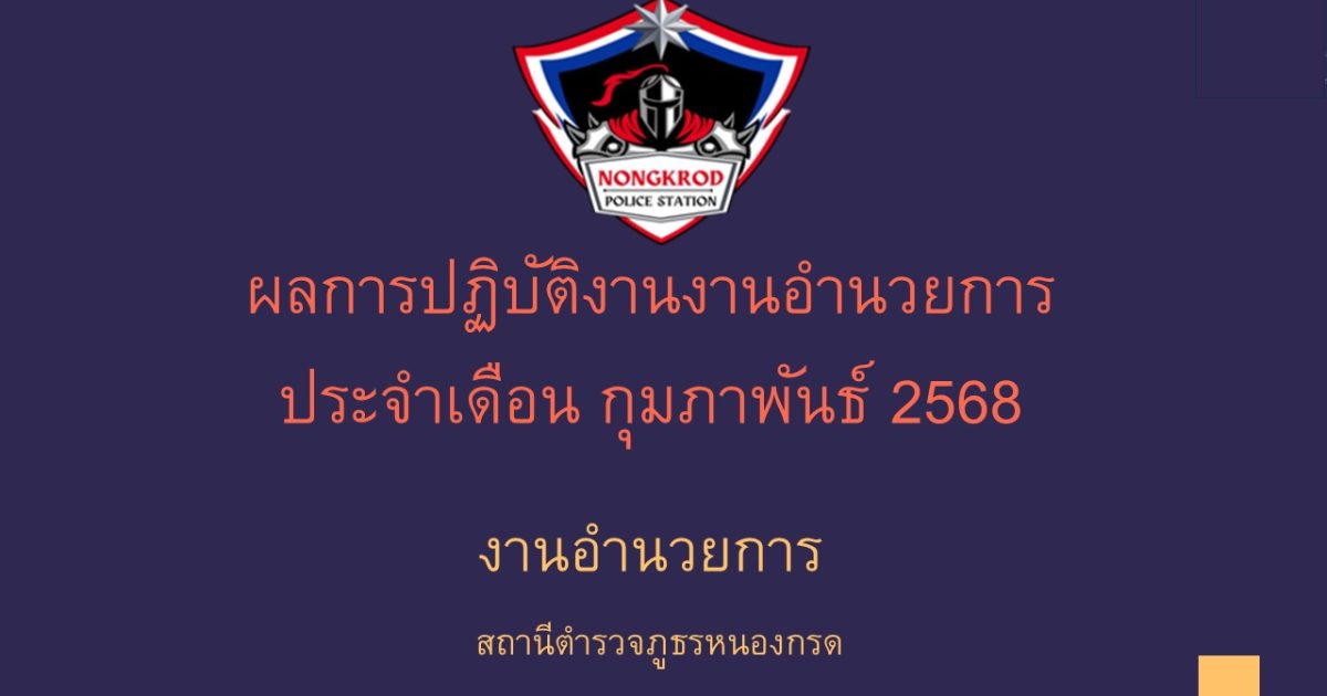 ผลการปฏิบัติงานงานอำนวยการ ประจำเดือน กุมภาพันธ์ 2568 28 กุมภาพันธ์ 2025 โดย admin / ข่าวประชาสัมพันธ์,ผลการปฏิบัติงานในสถานีตำรวจ 5 สายงาน,งานอำนวยการ,ข่าวประชาสัมพันธ์,ผลการปฏิบัติงานในสถานีตำรวจ 5 สายงาน ดาวน์โหลดไฟล์ PDF ผลการปฏิบัติงาน เดือน ก.พ.68 ดาวน์โหลดไฟล์ WORD ผลการปฏิบัติงาน เดือน ก.พ.68