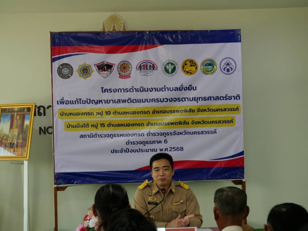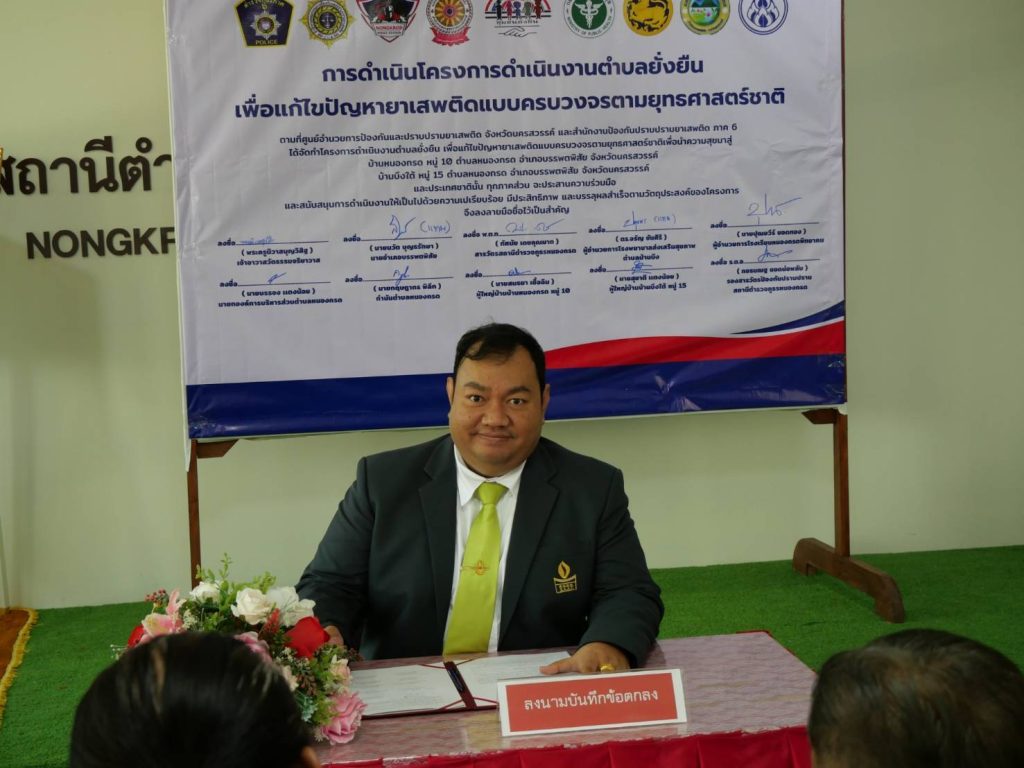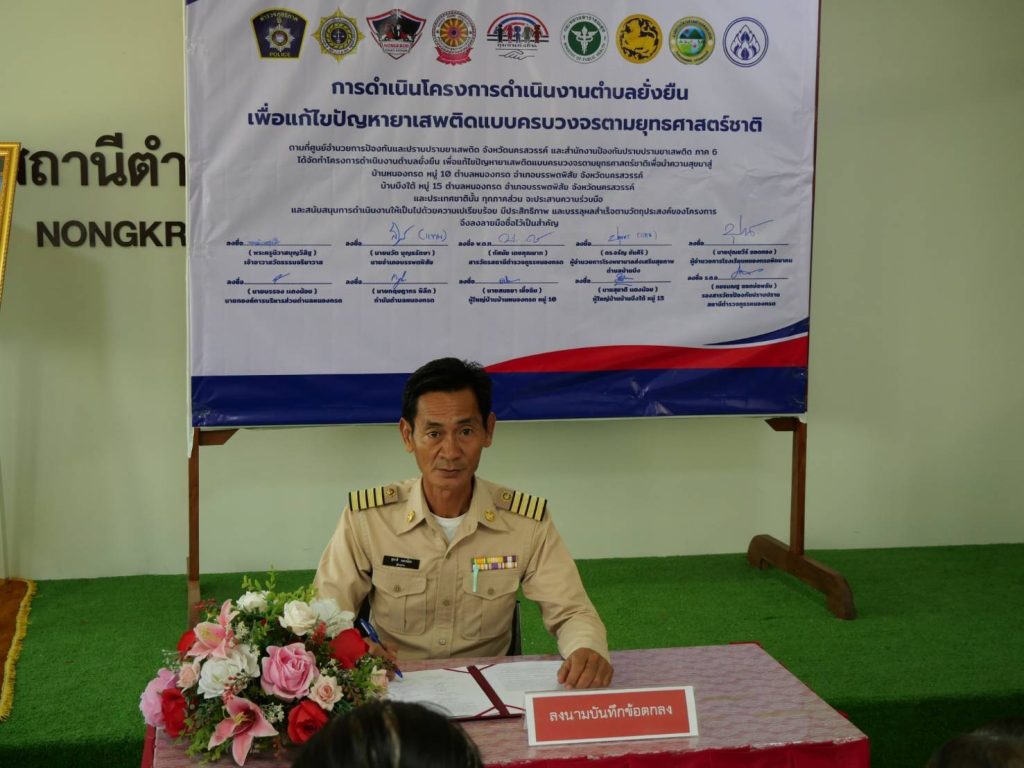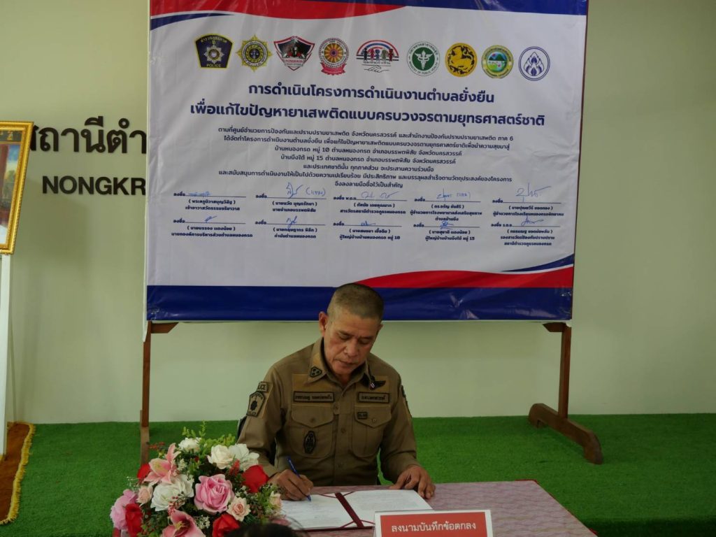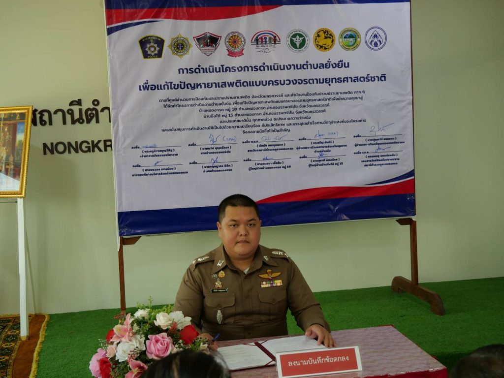 พิธีเปิดโครงการดำเนินงานตำบลยั่งยืน เพื่อแก้ไขปัญหายาเสพติดแบบครบวงจรตามยุทธศาสตร์ชาติ ประจำปีงบประมาณ พ.ศ.๒๕๖๘ สถานีตำรวจภูธรหนองกรด 12 มีนาคม 2025 โดย admin / ข่าวประชาสัมพันธ์,ข่าวกิจกรรม,ข่าวประชาสัมพันธ์,ข่าวฝากประชาสัมพันธ์,ข่าวภารกิจผู้บังคับบัญชา สภ.หนองกรดเรียน ผู้บังคับบัญชาวันนี้ ๑๒ มี.ค.๖๘ เวลา ๑๐.๐๐ น.นายสุรสิทธิ์ ลอยลมปลัดอำเภอ(เจ้าพนักงานปกครองชำนาญการพิเศษ) รรท.นายอำเภอบรรพตพิสัยประธานในพิธีเปิดโครงการดำเนินงานตำบลยั่งยืน เพื่อแก้ไขปัญหายาเสพติดแบบครบวงจรตามยุทธศาสตร์ชาติ ประจำปีงบประมาณ พ.ศ.๒๕๖๘โดยมีพระครูนิวาสบุญวิสิฐเจ้าอาวาสวัดธรรมจริยาวาส ,พ.ต.ท.ทัศนัย เดชคุณมากสว.สภ.หนองกรด ,นายบรรจง แตงน้อยนายก อบต.หนองกรด ,นายปุณยวีร์ ยอดทองผอ.รร.หนองกรด ,น.ส.ปทุมพร เย็นใจนักวิชาการสาธารณสุข(ทันตสาธารณสุข) รพ.สต.บ้านบึง ,นายกฤษดากร พิลึก กำนัน ต.หนองกรด ,นายสนธยา เชื้อฉิมผู้ใหญ่บ้านบ้านหนองกรด หมู่ ๑๐ ,นายสุชาติ แตงน้อยผู้ใหญ่บ้านบ้านบึงใต้ หมู่ ๑๕พร้อมด้วยชุดปฏิบัติการตำบลยั่งยืน สภ.หนองกรด เข้าร่วมพิธีเปิดโครงการฯ และร่วมลงนามบันทึกข้อตกลง (MOU) ตามโครงการดำเนินงานตำบลยั่นยืน เพื่อแก้ไขปัญหายาเสพติดแบบครบวงจรตามยุทธศาสตร์ชาติณ ห้องประชุมมณีจักร สภ.หนองกรด ต.หนองกรด อ.บรรพตพิสัย จ.นครสวรรค์จึงเรียนมาเพื่อโปรดทราบ