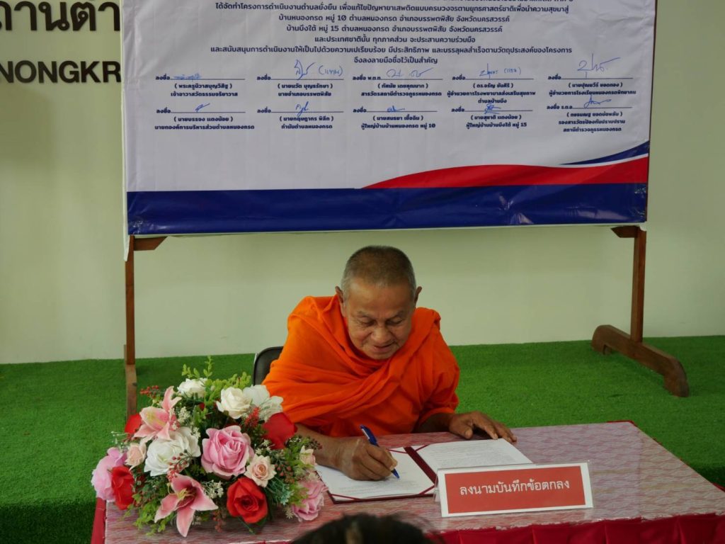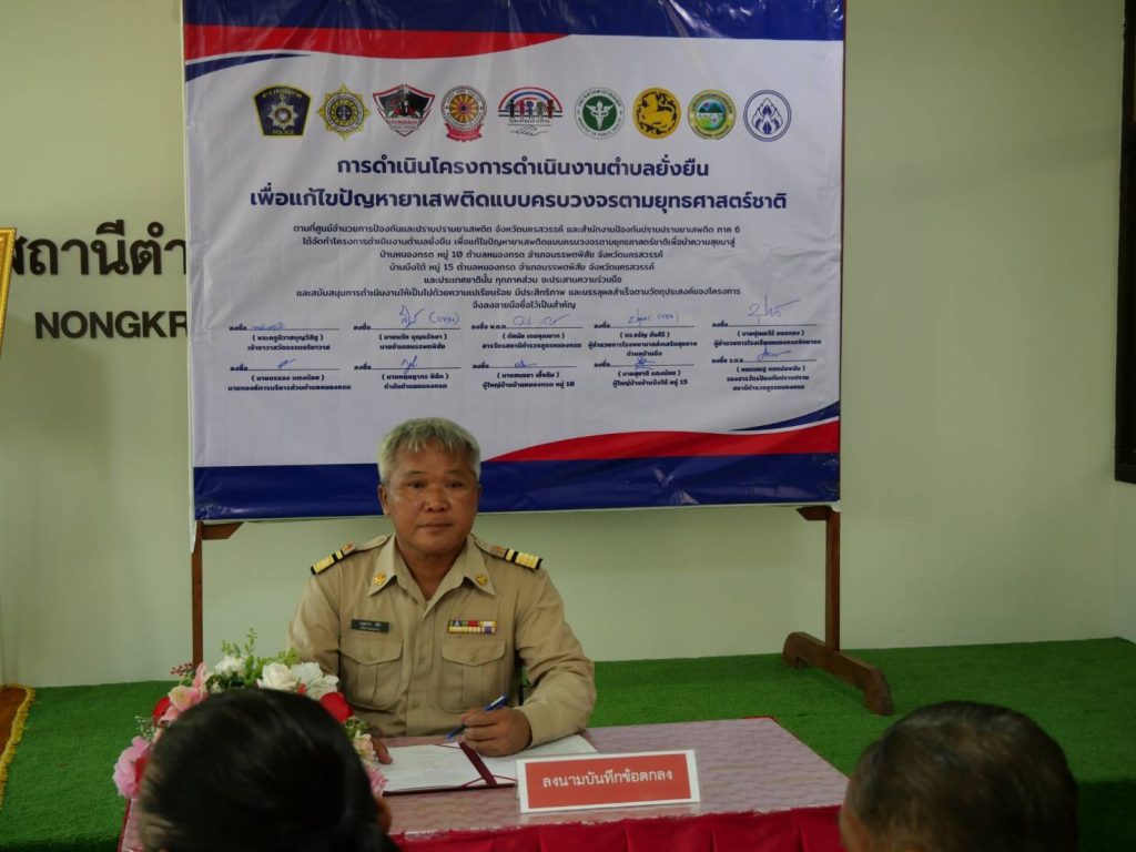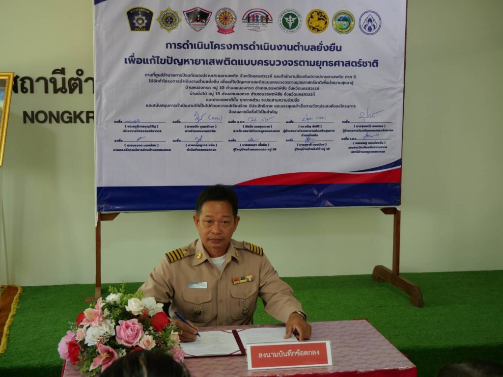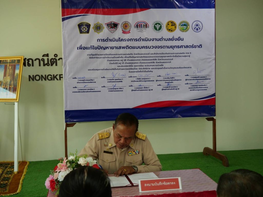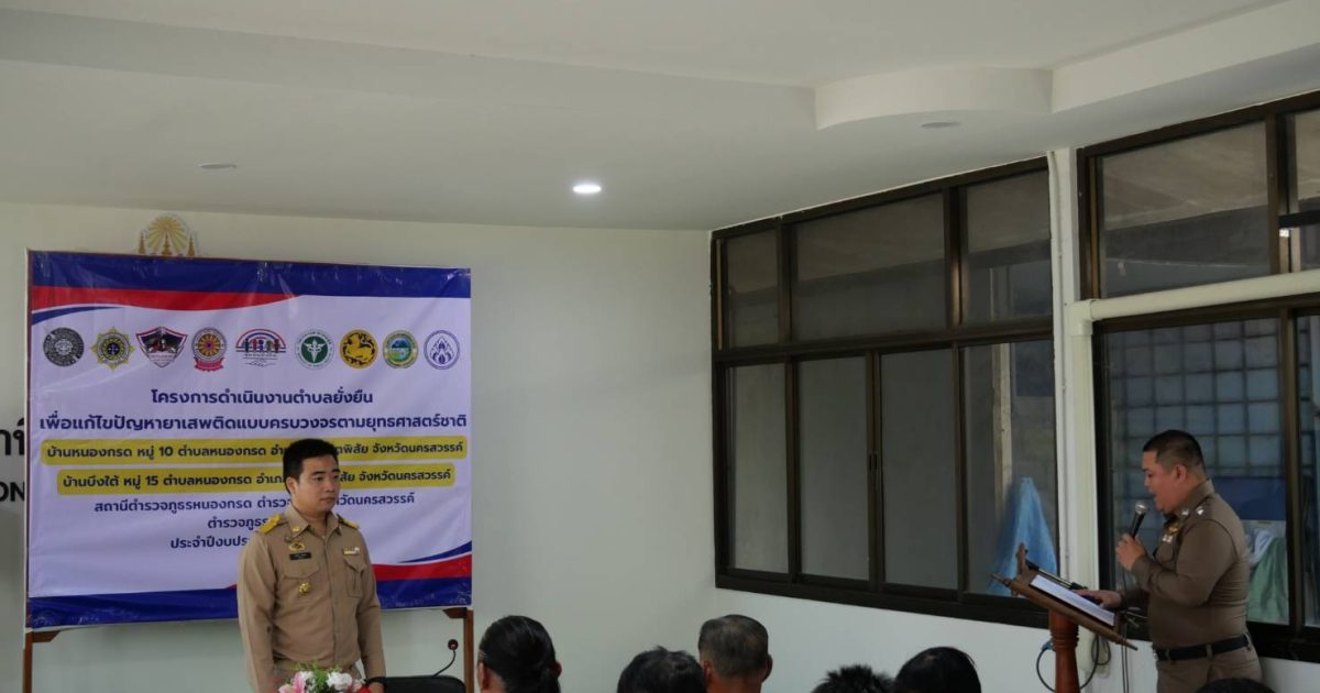 พิธีเปิดโครงการดำเนินงานตำบลยั่งยืน เพื่อแก้ไขปัญหายาเสพติดแบบครบวงจรตามยุทธศาสตร์ชาติ ประจำปีงบประมาณ พ.ศ.๒๕๖๘ สถานีตำรวจภูธรหนองกรด 12 มีนาคม 2025 โดย admin / ข่าวประชาสัมพันธ์,ข่าวกิจกรรม,ข่าวประชาสัมพันธ์,ข่าวฝากประชาสัมพันธ์,ข่าวภารกิจผู้บังคับบัญชา สภ.หนองกรดเรียน ผู้บังคับบัญชาวันนี้ ๑๒ มี.ค.๖๘ เวลา ๑๐.๐๐ น.นายสุรสิทธิ์ ลอยลมปลัดอำเภอ(เจ้าพนักงานปกครองชำนาญการพิเศษ) รรท.นายอำเภอบรรพตพิสัยประธานในพิธีเปิดโครงการดำเนินงานตำบลยั่งยืน เพื่อแก้ไขปัญหายาเสพติดแบบครบวงจรตามยุทธศาสตร์ชาติ ประจำปีงบประมาณ พ.ศ.๒๕๖๘โดยมีพระครูนิวาสบุญวิสิฐเจ้าอาวาสวัดธรรมจริยาวาส ,พ.ต.ท.ทัศนัย เดชคุณมากสว.สภ.หนองกรด ,นายบรรจง แตงน้อยนายก อบต.หนองกรด ,นายปุณยวีร์ ยอดทองผอ.รร.หนองกรด ,น.ส.ปทุมพร เย็นใจนักวิชาการสาธารณสุข(ทันตสาธารณสุข) รพ.สต.บ้านบึง ,นายกฤษดากร พิลึก กำนัน ต.หนองกรด ,นายสนธยา เชื้อฉิมผู้ใหญ่บ้านบ้านหนองกรด หมู่ ๑๐ ,นายสุชาติ แตงน้อยผู้ใหญ่บ้านบ้านบึงใต้ หมู่ ๑๕พร้อมด้วยชุดปฏิบัติการตำบลยั่งยืน สภ.หนองกรด เข้าร่วมพิธีเปิดโครงการฯ และร่วมลงนามบันทึกข้อตกลง (MOU) ตามโครงการดำเนินงานตำบลยั่นยืน เพื่อแก้ไขปัญหายาเสพติดแบบครบวงจรตามยุทธศาสตร์ชาติณ ห้องประชุมมณีจักร สภ.หนองกรด ต.หนองกรด อ.บรรพตพิสัย จ.นครสวรรค์จึงเรียนมาเพื่อโปรดทราบ