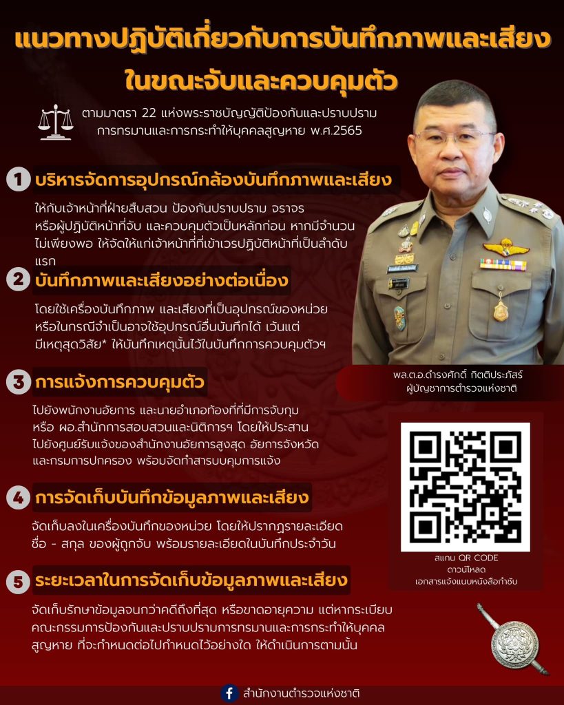 แนวทางการปฏิบัติเกี่ยวกับการบันทึกภาพและเสียงในขณะจับและควบคุมตัว 20 พฤษภาคม 2023 โดย admin / ข่าวประชาสัมพันธ์,ข่าวฝากประชาสัมพันธ์ พล.ต.อ.ดำรงศักดิ์ กิตติประภัสร์ ผบ.ตร. กำชับ “แนวทางการปฏิบัติเกี่ยวกับการบันทึกภาพและเสียงในขณะจับและควบคุมตัวตามมาตรา 22 แห่ง พ.ร.บ.ป้องกันและปราบปรามการทรมานและการกระทำให้บุคคลสูญหาย พ.ศ.2565”🟠1. บริหารจัดการอุปกรณ์กล้องบันทึกภาพและเสียง🟡2. บันทึกภาพและเสียงอย่างต่อเนื่อง🟢3. การแจ้งการควบคุมตัว🟣4. การจัดเก็บบันทึกข้อมูลภาพและเสียง🔵5. ระยะเวลาในการจัดเก็บข้อมูลภาพและเสียง